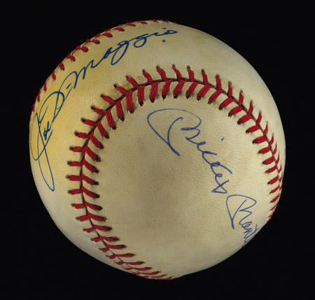Description:Joe DiMaggio and Mickey Mantle autographed baseball. B.Brown AL ball is signed on the sweet spot by DiMaggio in blue ink and Mantle on an adjacent side panel in blue ink. DiMaggio rates 10 out of 10 with Mantle rating 9 out of 10. The ball itself has a bit of light NM-NM/MT