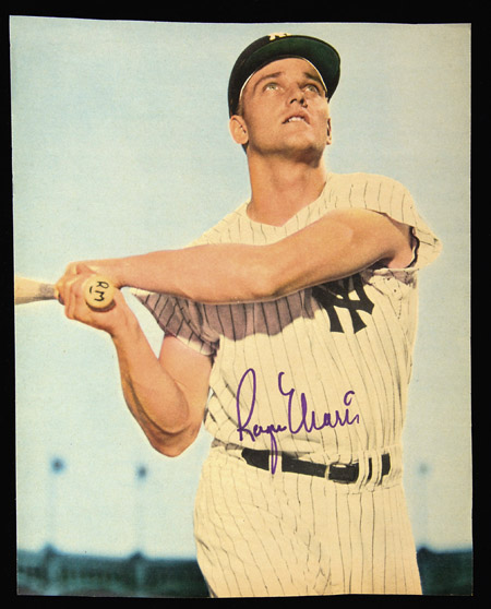 Description:Roger Maris autographed photograph. 8"x10" printed color publication photo picturing Maris batting is signed boldly across the front in purple sharpie. Signature rates 10 out of 10. Includes LOA from JSA and COA from Global Authentication: NM