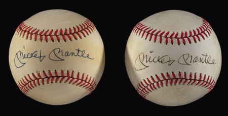 Description:Lot of (2) Mickey Mantle single signed baseballs. Pair of lightly toned B.Brown AL baseballs are each signed across the sweetspot in blue ink, "Mickey Mantle." Signatures rate 7/8 and 8/9 out of 10. Includes LOA from JSA: Overall EX-EX/MT