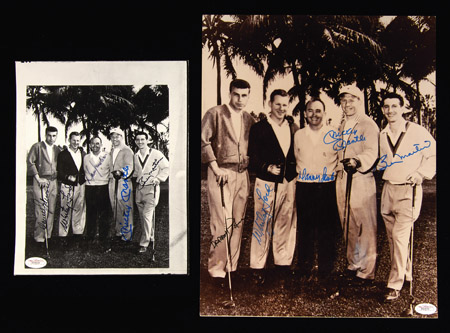 Description:Lot of (2) Mickey Mantle, Billy Martin, and Whitey Ford autographed golfing photographs. Includes 11"x14" black color tinted photo signed by Danny Lawlor (golf pro), Mantle, Ford, and Martin in blue sharpie. "Darrell Johnson" autograph appears to be a period printed "identifier". Signatures range from 8-10 out of 10. The other photo is a smaller version of the first, measuring 8"x10" and signed by the same five individuals with the exception that Darrell Johnson has actually signed this example. Signatures range from 8-10 out of 10. Includes (2) individual LOAs from JSA: NM