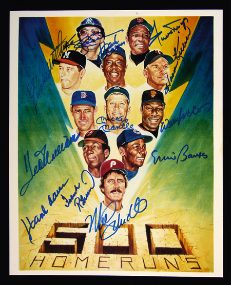 Description:500 Home Run Club autographed photographic display piece. Color 8"x10" photo display after the original Ron Lewis artwork piece has been signed by (11) members of the 500HR club including Mantle, Williams, Aaron (signed twice), Schmidt, Mays, Mathews, Jackson, McCovey, Banks, Robinson and Killebrew. Includes LOA from JSA: NM