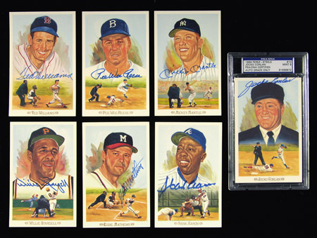 Description:1989 Perez-Steele "Celebration" postcard set with (40) autographed cards. Boxed commemorative set features color lithographic player postcards, (40) of which have been autographed. Signed examples include T.Williams, Mantle, Aaron, Reese, Snider, Stargell, and Jocko Conlan (Graded PSA/DNA 9 MINT). Includes LOA from JSA: NM