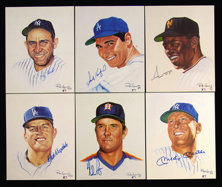 Description:Set of autographed 1989 Ron Lewis "Living Legends" artwork cards. Numbered set 1512 of 5000 with a total of (20) 8"x10" color cards, each of which has been signed by the respective player including Mantle, Drysdale, Berra, Mays, Ford, Koufax, Rose, Mathews, Jackson, and Ryan. Includes LOA from JSA: NM