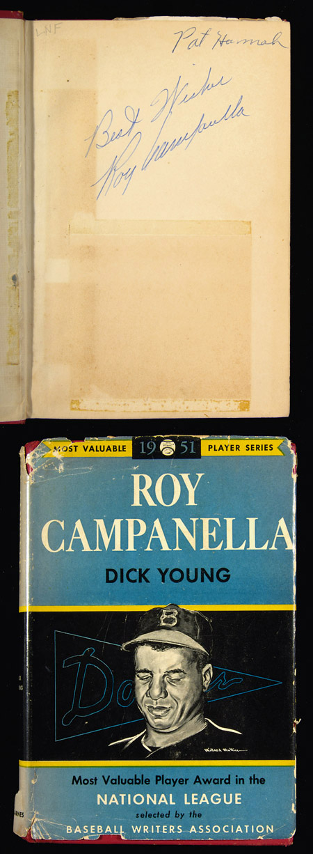 Description:Roy Campanella autographed Most Valuable Player Series hardcover book. 1952 Edition from the popular A.S.Barnes series is signed on the first inside page "Best Wishes, Roy Campanella" in blue ink rating 8 out of 10. Dust jacket exhibits wear throughout. Book itself has minor exterior wear with scattered interior toning that affects several pages incl. signature page. Additional ink signature and pencil notation appears on first inside page. Includes LOA from JSA: Dust jacket: VG, Book: EX
