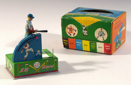 Description:"All-Stars Mr. Baseball Jr." baseball tin toy in its original box c.1950s. Unused mechanical tin toy features a wind up batter in unused mint condition with desirable "7" on the back of the uniform. Believed to have been modeled after Mickey Mantle. Includes the original box with colorful baseball decoration (lid intact but detached) and the unopened bag of player marbles. 7" tall: Toy: NM, Box: EX