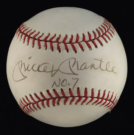 Mickey Mantle single signed baseball with "No.7" inscription. B.Brown AL ball is signed across the sweet spot by Mantle in black ink. Signature rates 8 out of 10. Includes LOA from JSA: EX/MT