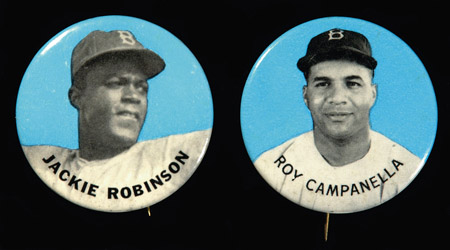 Jackie Robinson and Roy Campanella stadium pins c.1950s. Pair of 1.75" blue background pins in fine condition with light discoloration to front of Campanella and minimal rust to backs of both: EX/MT