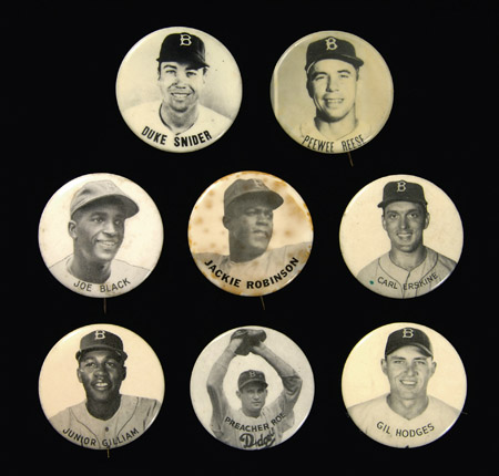 Description:Lot of (8) Brooklyn Dodgers stadium pins c.1950s. Similarly styled white background 1.75" pins include Jackie Robinson, Pee Wee Reese, Gil Hodges, Duke Snider, Preacher Roe, Joe Black, Junior Gilliam, and Carl Erskine. Clean fronts, although Robinson exhibits moderate toning. Light to moderate rust on backs, more pronounced on Snider and Reese: Range VG/EX-EX/MT, Avg EX-EX/MT