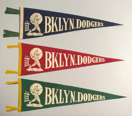 Lot of (3) Brooklyn Dodgers pennants c.1940s. Trio of pennants, each employing a similar design set against a different colored background. Minor wear: EX-EX/MT