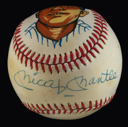 Description:Mickey Mantle single signed portrait baseball. Lightly toned MacPhail AL ball is signed by Mantle across the sweet spot in blue ink rating 8/9 out of 10. The top panel of the ball features a hand painted portrait of Mantle in Yankees uniform. Includes LOA from JSA: Ball: EX-EX/MT, Signature: NM