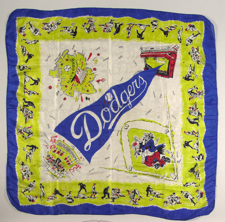 Brooklyn Dodgers souvenir scarf c.1951. 32" square silk scarf depicts various Dodgers scenes incl. Bum artwork by Mullin, Ebbets Field, and player graphics. Retains vibrant original colors: EX-MT