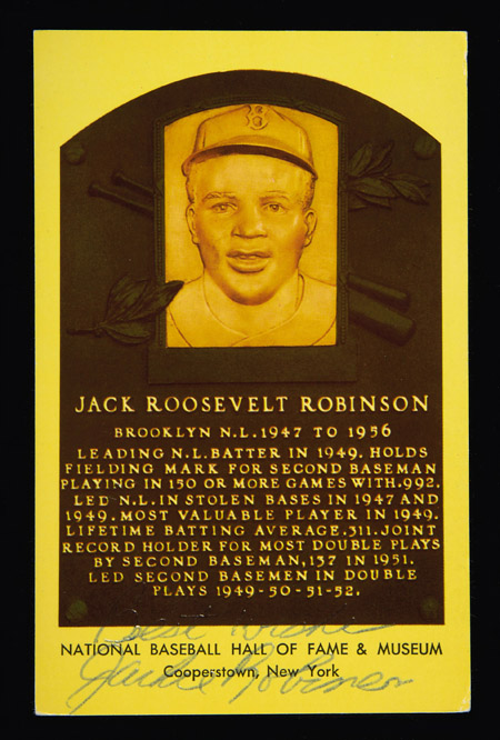 Jackie Robinson autographed yellow Hall of Fame postcard. Signed at the bottom in blue ink, "Best Wishes Jackie Robinson". Signature rates 8 out of 10. Includes LOA from JSA: EX/MT-NM