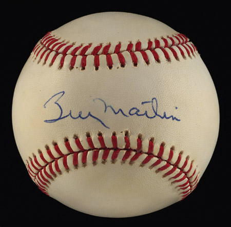 Billy Martin single signed baseball. B.Brown AL ball is signed across the sweet spot in blue ink rating 8 out of 10. Ball exhibits very minor even toning. Includes LOA from JSA: EX/MT