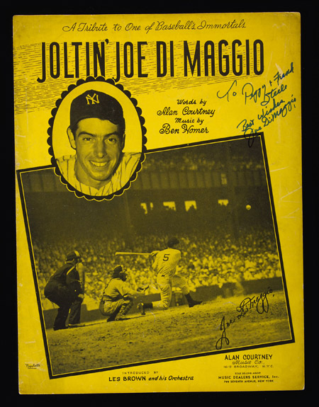 Description:1941 "Jolting Joe DiMaggio" sheet music autographed by DiMaggio. Original sheet music for one of the most recognizable and popular baseball songs ever written features great imagery including a shot of DiMaggio batting at Yankee Stadium and an inset head shot. DiMaggio has signed the cover, "To Peggy and Frank Steele Best Wishes Joe DiMaggio" in blue sharpie. Signature rates 9 out of 10. Includes letter of provenance from Peggy Steele: Sheet music: EX, Signature: MT