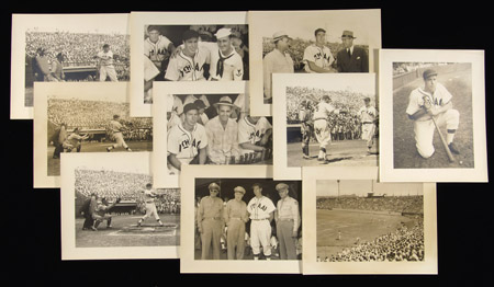 Description:Set of (10) vintage Joe DiMaggio WWII related photographs from the DiMaggio family. Very fine set of matte finish 8"x10" sepia tone images picture DiMaggio in his military baseball uniform. Subjects include DiMaggio batting, crowd/stadium view, DiMaggio kneeling, and a fine set of three sequential batting scenes. Photos originate directly from the Joe DiMaggio Collection. Includes LOA from DiMaggio family: EX-MT
