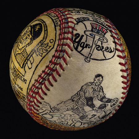 Description:Bill Dickey hand painted folk art baseball by George Sosnak. J.Cronin AL baseball has been intricately hand painted and stenciled on all panels by George Sosnak. One panel has rendering of Dickey making a play at home plate with an enhanced signature below and Yankees logo above. Other panels bear notations regarding Dickey's career and likeness of his Hall of Fame plaque. Minor age toning and scattered wear: EX