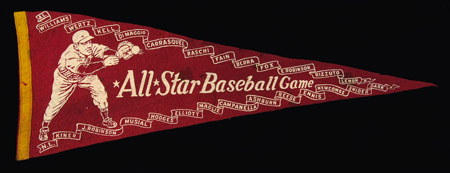 Description:1951 All-Star game souvenir pennant. Red pennant features a scroll at top and bottom with both AL and NL player names incl. Reese, Robinson, Williams, DiMaggio, and Campanella. Surface has some general light wear and a small hole in the center: VG-EX