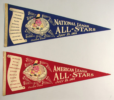 Description:Pair of 1954 All Star Game souvenir pennants. Includes one each for the National League and American League All-Stars for the game played at Cleveland. Blue and red pennants feature respective players' names on a scroll at left side including Mickey Mantle, Yogi Berra, Jackie Robinson, Roy Campanella, and Duke Snider. The red AL pennant has some light wear to the white strip at the left and some small holes at the point. Blue NL pennant has some general light surface wear and a pinhole at the point. Both pennants are missing their original tassels: EX