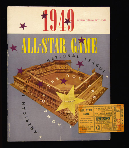 Description:1949 Baseball All-Star Game program and ticket stub. Vintage program issued for the game played at Ebbets Field is unscored exhibiting light exterior wear and age toning with vertical center fold. Corresponding ticket stub has cleanly torn left edge with tape stains in each corner: VG-EX