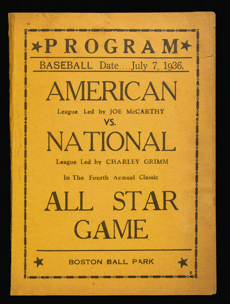 Description:1936 All-Star Game program. Obscure foldout scorecard issued for the game played at Boston remains unscored and features printed lineups on the interior for the AL and NL teams including Gehrig, Grove, DiMaggio, Ott, Hartnett, and Dean. Front cover has a small edge tear and some minor wrinkling: VG-EX