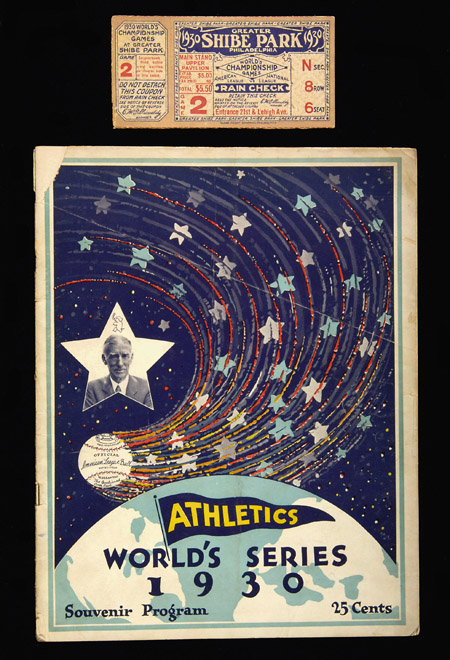 Description:1930 World Series program and ticket stub. Original program issued for a game played at Philadelphia's Shibe Park between the Athletics and Cardinals. Program remains unscored with some general wear to the covers including creasing and small corner chip: VG. Includes full ticket stub to Game #2 of the 1930 World Series at Philadelphia: VG-EX