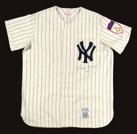 Mickey Mantle autographed jersey. New York Yankees 1951 home replica jersey signed on the front by Mantle in blue sharpie with "No. 7" notation. Signature rates 8/9 out of 10. Includes LOA from JSA: NM