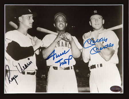 Description:Mickey Mantle, Roger Maris, and Willie Mays autographed photograph. Uncommon 8"x10" black and white photograph has been signed across the front by all (3) legendary New York players in marker. Signatures rate 8-9 out of 10. Triple matted and framed to 15.5"x17.5" overall display. Includes LOAs from JSA and PSA/DNA: NM