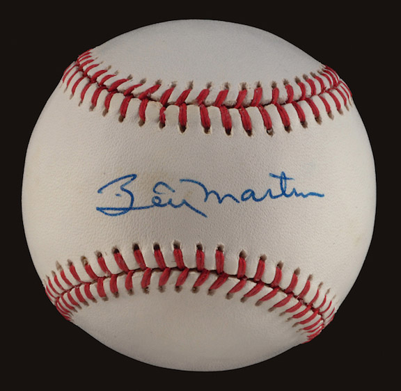 Billy Martin single signed baseball. Rawlings B.Brown OAL baseball has been signed on the sweet spot, "Billy Martin." Blue ink signature rates 8-9 out of 10. Includes LOA from JSA: EX/MT-NM
