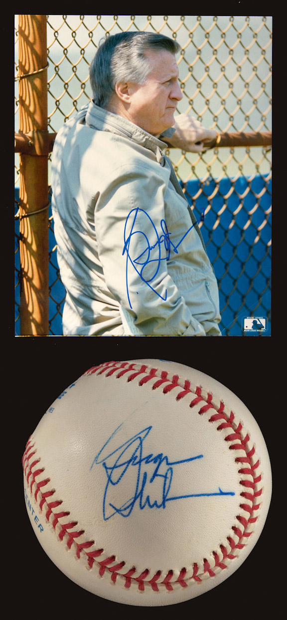 Description:George Steinbrenner autographed photograph and single signed baseball. Includes 8"x10" color photograph signed across the front and B.Brown OAL baseball signed on the side panel. Signatures rate 8-9 out of 10. Includes LOA from JSA: EX//MT-NM