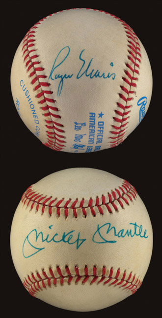 Description:Mickey Mantle and Roger Maris autographed baseball from the personal collection of Barry Halper. MacPhail AL ball signed by Mantle across the sweet spot and Maris on an adjacent side panel in blue ink. Signatures remain very strong rating 9/10 out of 10 each. The ball itself exhibits only some very minor age toning with bold manufacturer's stampings. This particular example of the famed Yankees duo originated from the personal collection of Barry Halper. As recounted by Halper in the included letter of provenance, he had asked Maris to sign the ball first to which Roger replied that he would only sign the side panel leaving the sweet spot for Mickey. Halper later had Mantle sign the ball and fondly recalled this story years later. Very strong exemplar with desirable Halper Collection provenance. Includes LOA from JSA and letter of provenance on Yankees/Halper stationary signed by Halper: Ball: EX/MT-NM, Signatures: NM-MT