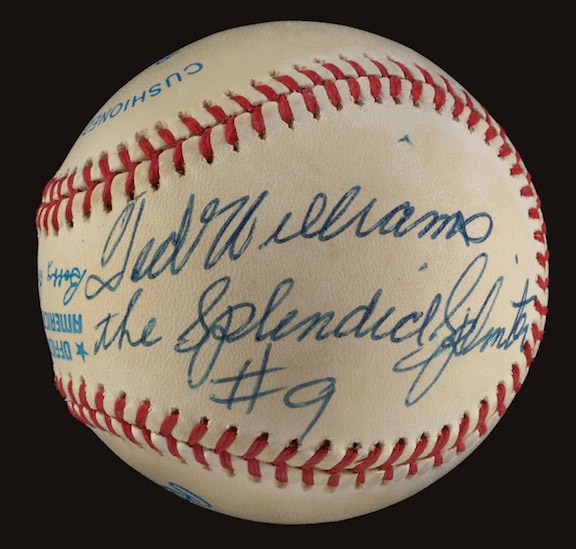 Description:Ted Williams single signed baseball with rare inscriptions. Lightly toned B.Brown OAL baseball is signed by Williams on the side panel with "The Splendid Splinter" and "#9" inscriptions. Signature rates 8 out of 10. The first Williams ball we have handled with this combination of inscriptions offering fine display value. Includes LOA from JSA. Ball: EX-EX/MT, Sig: EX/MT