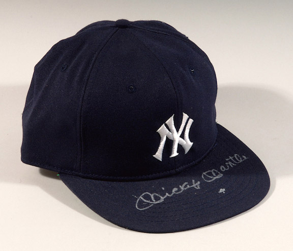 Description:Mickey Mantle autographed hat. Classic dark blue New York Yankees hat with embroidered interlocking "NY" logo has been signed on the brim, "Mickey Mantle." Silver paint pen signature rates 8-9 out of 10 with slight skip at start. "Roman Pro", size "7 3/8", and MLB logo tags on inside. Includes LOA from JSA: NM