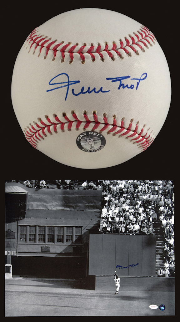 Description:Willie Mays autographed baseball and photograph. Includes B.Selig OML ball signed on the sweet spot and black and white 16"x20" photograph of "The Catch." Both signed in blue marker rating 9/10 out of 10. Mays' personal authentication hologram affixed to both. Includes LOA from JSA and COA from PSA/DNA (ball): Overall EX/MT-NM