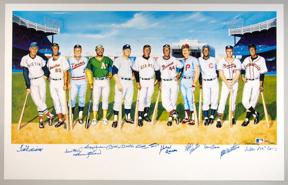 Description:* Updated Description * 500 Home Run Club autographed lithograph. 24"x38" (visible area) color print by Ron Lewis is signed by 11 members of the 500 HR Club including Williams, F. Robinson, Killebrew, Jackson, Mantle, Mays, Aaron, Schmidt, Banks, Mathews, and McCovey in blue sharpie. Additionally signed by artist Ron Lewis and numbered "503/1,000". It should be noted that the offered is one a limited number of lithographs produced for the initial 1989 signing and should not be confused with the more commonly available poster. Signatures rate 9 out of 10. Includes LOA from JSA: NM
