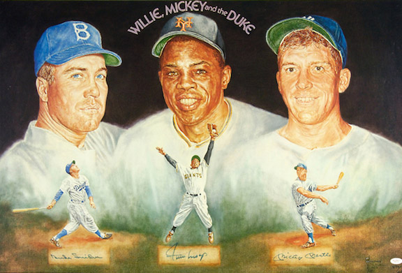 Description:"Willie, Mickey, and The Duke" autographed poster. Large format artwork poster has been signed on the front by Mickey Mantle, Willie Mays, and Duke Snider. Blue marker signatures rate 8-9 out of 10. Framed to overall dimensions of 44"x33". Limited edition numbered 474/1603. Includes LOA from JSA: Overall EX/MT-NM