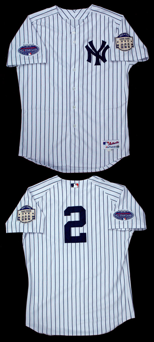 Description:2008 Derek Jeter New York Yankees game used home jersey. There is perhaps no other player in the game today whom exudes professionalism and sportsmanship at the level of Derek Jeter. As the Captain of baseball’s cornerstone team he has been with the Yankees through (5) Championship seasons and it appears he will be one of the very few modern-era athletes at his level to play his entire career with the same Franchise. 2008 Marked an important year for the Yankees as New York played host to the All-Star Game and their famed Stadium was used for the final time. Classic pinstriped home jersey with Yankees interlocking “NY” logo on chest and player number “2” on back. “Majestic” manufacturer’s tag on front tail with adjacent size “48” and year “2008” flag tags. Desirable “2008 All-Star Game” and “Yankee Stadium 1923 – 2008” patches on sleeves. Proper “0062” wash tag on interior. Exhibits moderate usage wear. Includes LOA from Hunt Auctions and additional letter from Steiner Sports with matching numbered “Game Used” hologram affixed. One of the finest modern-era jerseys we have handled: EX