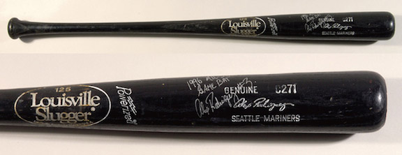 Description:Alex Rodriguez 1996 All-Star Game professional model baseball bat. Louisville Slugger 125 model bat measures 34" long and weighs 31.4 oz. The bat shows evident use including ball marks, stitching impressions, pine tar residue, and repaired handle crack. Model #C271 stamped on the barrel end along with "Seattle mariners" team name. Signed in silver sharpie, "1996 All-Star Game Bat Alex Rodriguez #3". Very fine game bat dating to Alex Rodriguez's inaugural All-Star Game appearance which includes a COA noting its All-Star Game use signed by Rodriguez himself. Includes LOAs from Hunt Auctions (bat), JSA (autograph), COA from Coast to Coast Sports signed by Alex Rodriguez, and MEARS Authentication (bat, graded A9): EX
