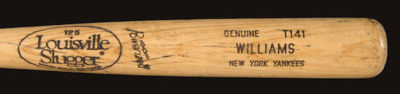 Description:Bernie Williams professional model baseball bat c.1992-93. Louisville Slugger 125 model bat measures 34" long and weighs 32 oz. Bat shows evident use including rack marks, ball marks, stitching impressions, and light checking to the back of the barrel. Model #T141 stamped on the barrel end with "BW" written in black marker on the knob end. Includes LOA from Hunt Auctions: EX