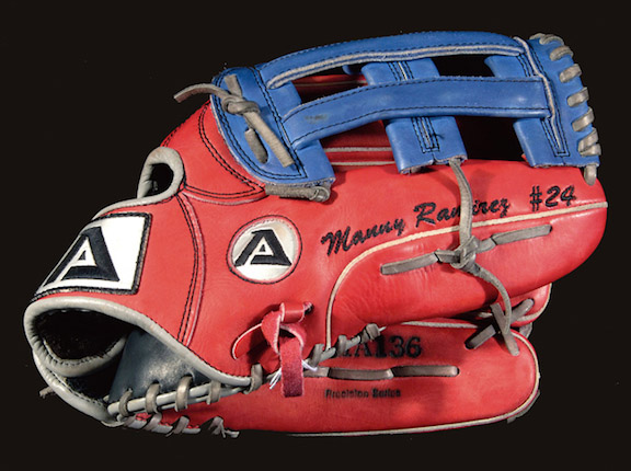 Description:Manny Ramirez professional model baseball glove c.2004-07. Red, blue, and silver leather glove retains its original Akadema manufacturer's markings with "Manny Ramirez #24" embroidered monogram on the exterior. The glove display evident usage wear inclusive to the interior pocket and leather surface. Model #AMA136 is found on the interior. Includes LOA from Hunt Auctions: EX
