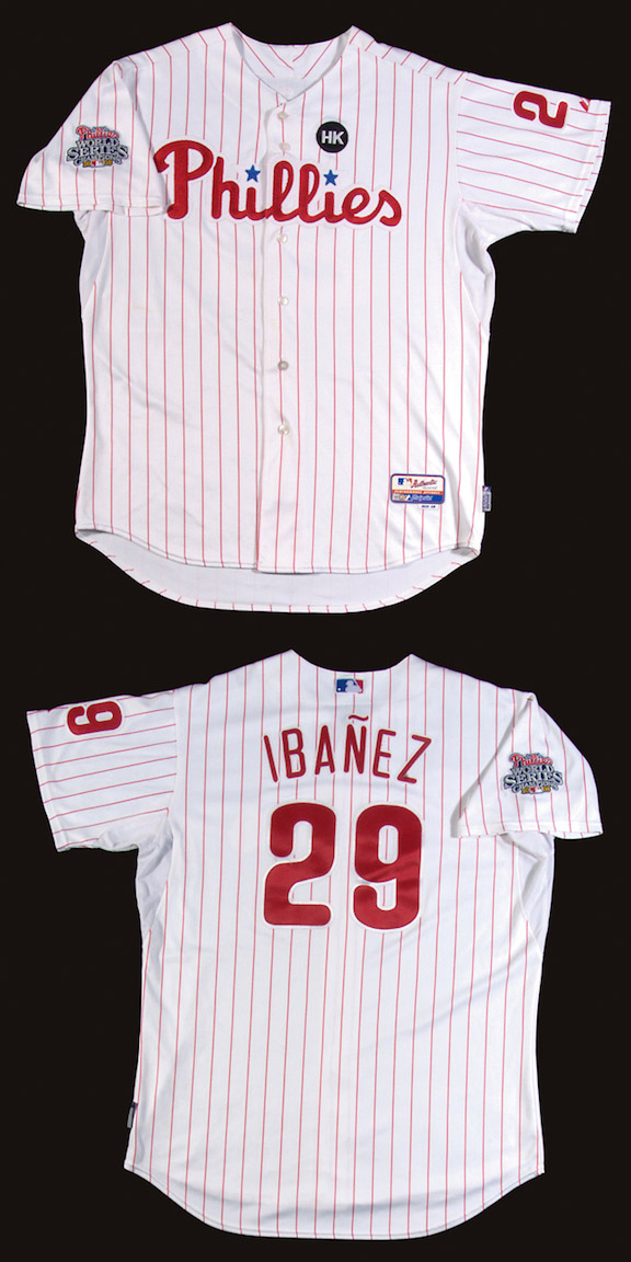 Description:2009 Raul Ibanez Philadelphia Phillies game used jersey. Home pinstriped jersey with "Phillies" team name lettered across the front and player name "Ibanez" and number "29" on the back. Number also appears on left sleeve with "2008 World Series Champions" patch on right. On the chest is a circular black "HK" memorial patch. Proper "Majestic" and "Cool Base" tagging on front tail with size "50." Wash tag on interior with "0063" number code. Exhibits moderate usage wear. MLB Authentication hologram (446756 LH) affixed. Includes LOA from Hunt Auctions: EX