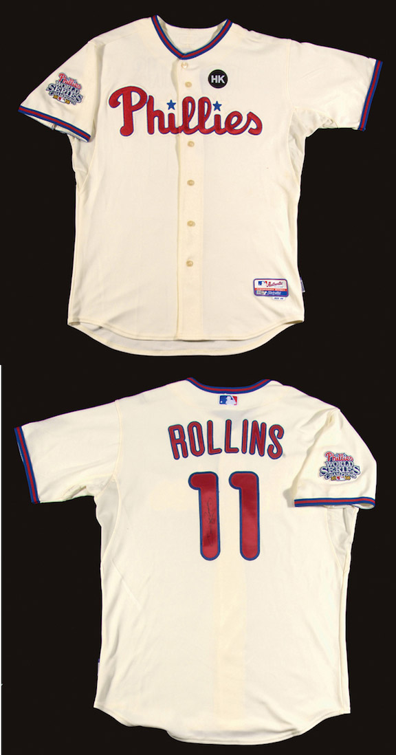 Description:2009 Jimmy Rollins Philadelphia Phillies game used professional model jersey. White knit home alternate jersey retains its original Phillies team name across the front with "Rollins" lettering on the back above #11. The front of the shirt displays the Harry Kalas memorial patch with the 2008 World Series Champions patch affixed to the right sleeve. Majestic tagging found on the tail front with "Cool Base" flag tag on the seam. Proper wash code tagging on the interior tail front with "09" strip tag. Signed by Rollins on the reverse. Exceptional game worn Phillies home jersey from the team catalyst and 2007 NL MVP. Includes LOA from Hunt Auctions and COA from the Philadelphia Phillies: EX-MT