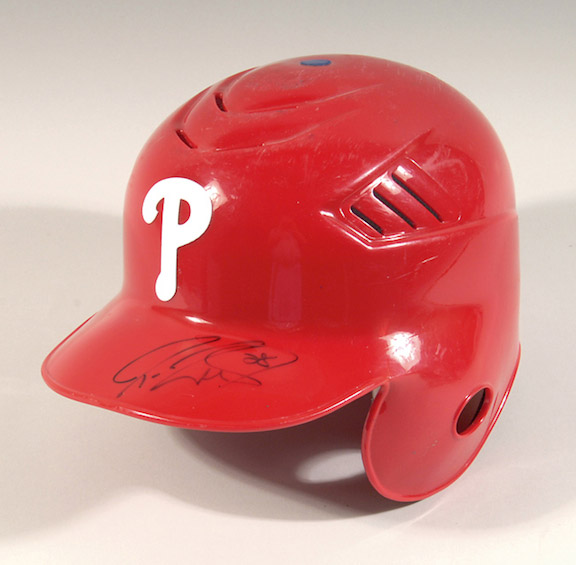 Description:Jason Werth autographed game used helmet. Philadelphia Phillies hard shell helmet as used by Werth having been signed on the bill in black sharpie. Retains "28" uniform number decals on the reverse and shows evident usage throughout with a small crack on ear flap side. MLB hologram label affixed to the interior. Includes LOA from Philadelphia Phillies: EX