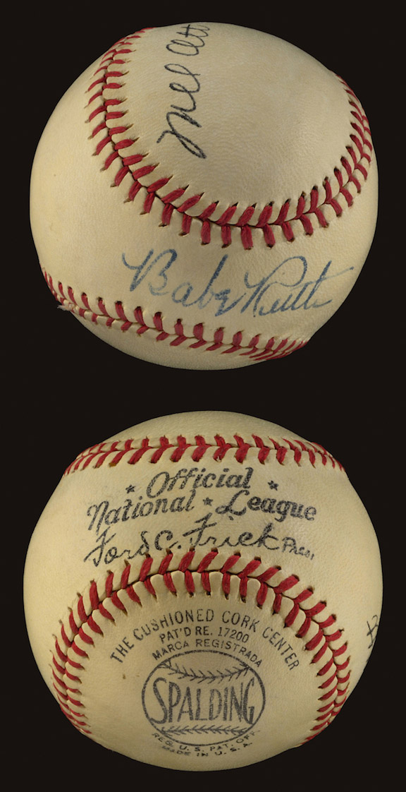 Description:Exceptional Babe Ruth and Mel Ott autographed baseball. The offered autographed baseball truly is not in need of very many descriptive superlatives. During the late 1930-40s era Babe Ruth hosted an NBC radio show as sponsored by Spalding Sporting Goods. Ruth would routinely welcome significant sports figures to the show, one of which was New York Giants slugger Mel Ott. On one such occasion a young man attended the show as part of the audience and in turn received the offered signed baseball. F.Frick NL ball remains in pristine unused condition listing a very slight age toning as its only mentionable imperfection. Babe Ruth has neatly signed the sweet spot in crisp blue fountain pen with Mel Ott adding his signature in black ink to the panel above. Ruth signature rates a 9 out of 10 with the Ott rating slightly stronger at 9/10 out of 10. The rarity of this particular signed ball cannot be overstated and with the exception of its mate offered within this auction is the only such exemplar we have encountered. The ball also includes its original Spalding NL baseball paper bag. Magnificent signature piece with relation to a pair of legendary members of the 500 Home Run club. Includes LOA from JSA: Ball: NM, Signatures: Range NM-NM/MT