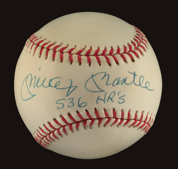 Mickey Mantle "536 HR's" single signed baseball. B.Brown AL ball signed across the sweet spot, "Mickey Mantle 536 HR's" in blue ink. Signature rates 9 out of 10. Includes full LOA from JSA: NM
