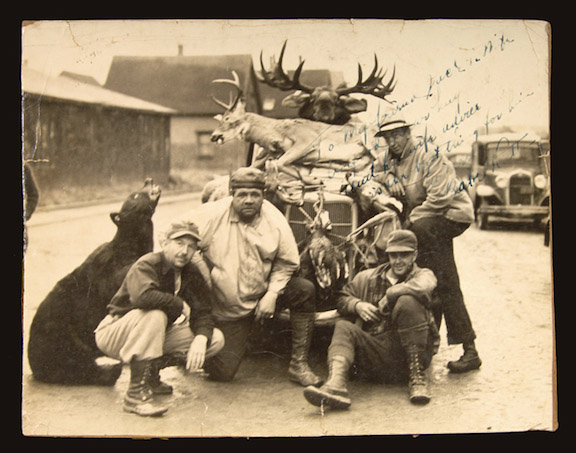 Description:Babe Ruth autographed large format photograph. 10.5"x13.25" Sepia toned photograph has been signed across the front, "To My Friend Jack & Wife, A good bear hug and his wife advice is the best thing for him, Sincerely Babe Ruth." Blue fountain pen signature rates 6/7 out of 10. Photo has mounted to heavy stock backing and has surface crazing/wrinkling throughout with several tears. Interesting period display piece retaining fine display qualities. Includes LOA from JSA: Photo VG-VG/EX, Autograph: EX-EX/MT