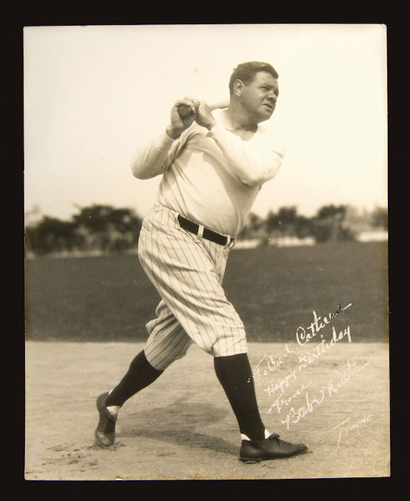 Description:Babe Ruth autographed photograph by Thorne c.1940s. Classic 8"x10" sepia toned photograph has been signed on the front, "To Carl Cathers, Happy Birthday from Babe Ruth." The black ink signature has largely flaked off the surface of the image leaving a white impression in its place. White Impression displays at a level of 5 out of 10. Photograph exhibits minor age toning and scattered wear with a slight period enhancement to the letters R and S. Framed. Includes LOA from JSA: Photo EX/MT, Autograph: VG