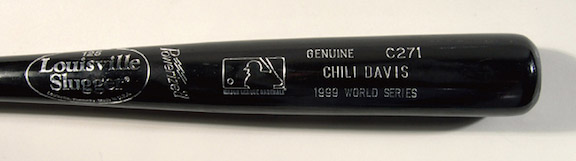 Description:Chili Davis 1999 World Series professional model bat. Louisville Slugger 125 professional model bat measures 33 3/4" long and weighs 31 oz. "Genuine C243, Chili Davis, 1999 World Series" is stamped in the barrel. Exhibits very light surface wear. Includes LOA from Hunt Auctions and letter of provenance from Chili Davis: EX/MT-NM