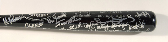 Description:1999 New York Yankees team autographed Chili Davis professional model World Series baseball bat. Louisville Slugger 125 professional model bat measures 33 3/4" long and weighs 31 oz. "Genuine C243, Chili Davis, 1999 World Series" is stamped in the barrel. The bat has been signed by approx. (26) including Jeter, Torre, Rivera, Martinez, Williams, Posada, Pettitte, and others. Silver paint pen signatures rate 8-9 out of 10 with very slight hairline smudge effecting a few. Exhibits no usage wear with light surface wear. Fine signed item related to one of the premier modern era teams with direct provenance. Includes LOA from JSA and letter of provenance from Chili Davis: Overall EX/MT-NM