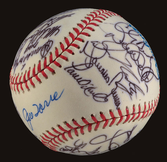 Description: 1999 New York Yankees World Champions team autographed baseball. Rawlings B.Selig Official 1999 World Series baseball has been signed by (27) including Jeter, Williams, Torre, Martinez, Cone, Clemens, Posada, Rivera, Girardi, and others. Blue ink signatures rate 8-9 out of 10 with slight bleed and stray ink marks. Includes LOA from JSA and letter of provenance from Chili Davis: Ball EX/MT-NM, Signatures: EX-EX/MT