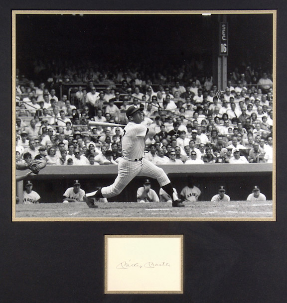 Mickey Mantle autographed framed display. 29.5"x29.5" Framed display including large ink signature rating 9 out of 10 and a stunning 16"x20" photograph of Mantle batting. Very fine visual display. Includes LOA from JSA: EX/MT-NM